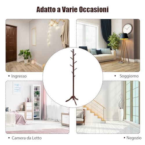 COSTWAY Attaccapanni in Legno, Attaccapanni da Terra con 8 Ganci Regolabili in Altezza, Albero Porta Abiti per Camera da Letto Soggiorno Ingresso e Ufficio, Carico 56 kg (Marrone)