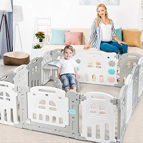 COSTWAY Box per Bambini Recinto di Gioco, Parco Giochi per Bimbi, con Porta Sedia e Tavolino, Ideale per Domestico o Asilo, 14 Pannelli
