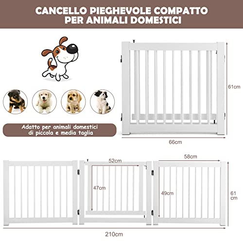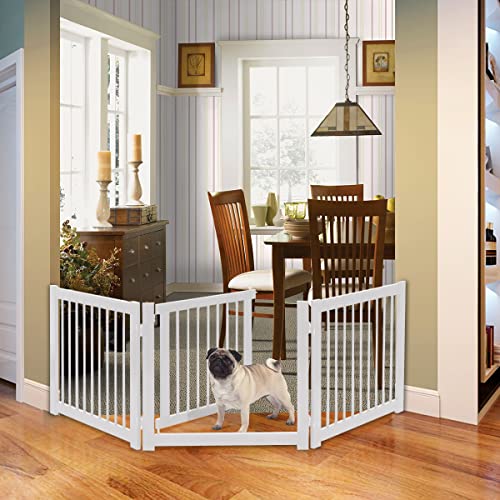 COSTWAY Cancelletto per Cani da Interno in Legno Massello, Design Girevole e Portatile, con 3 Ante, Cuscinetti Antiscivolo e Serratura, Ideale per Cani di Piccola/Media Taglia, 206 x 61 cm (Bianco)
