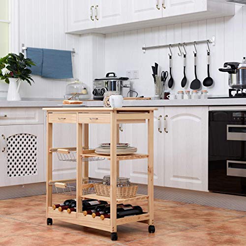 COSTWAY Carrello da Cucina con Ruote, Carrello con 2 Cassetti, Portabottiglie e Cestini Frutta in Metallo, Ripiani in Legno di Pino, Ideale per Cucina Bar Ristorante, 67 x 37 x 76 cm (Naturale)