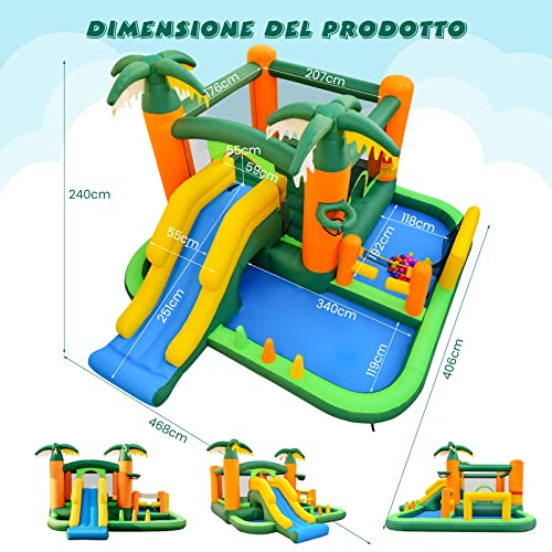 【Grande Castello a Tema di Palme】Il castello gonfiabile imita l'aspetto delle palme per creare un'isola tropicale unica. Inoltre, grazie alla sua grande dimensione di 468 x 406 x 240 cm, consente a 4 bambini di giocare insieme (totale: 180 kg, individuale: 45 kg).