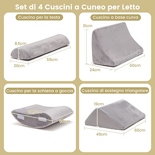 COSTWAY Set di 4/6 Cuscini Regolabili a Cuneo, Cuscino a Cuneo per Letto in Memory Foam, per Alleviare il Dolore alla Schiena Collo e alle Gambe, Poggiatesta Rimovibile, Grigio (4 Pezzi)