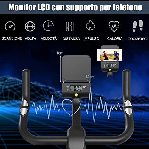 【Schermo LCD e Porta Cellulare】Lo schermo LCD e i sensori per i battiti cardiaci sul manubrio monitorano tempo, velocità, distanza, calorie bruciate e frequenza cardiaca così puoi regolare la velocità dell'esercizio per un allenamento più efficace. Il porta cellulare ti permette di pedalare e guardare un video o un film.
