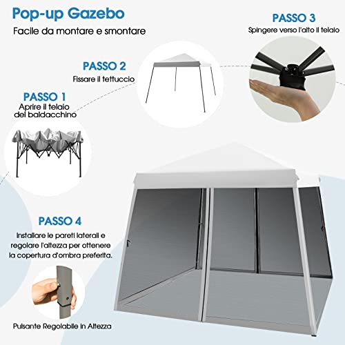 COSTWAY Gazebo Pop-up da Giardino 3 x 3 m, Tenda per Feste con Altezza Regolabile (237/255/246 cm), Gazebo Pieghevole da Esterno con Rete Impermeabile, per Campeggio, Giardino, Mercato (Bianco)
