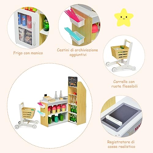 COSTWAY Gioco Negozio Bancarella per Bambini, Market Mercato in Legno, con Carrello della Spesa e Cassa, Bianco e Legno