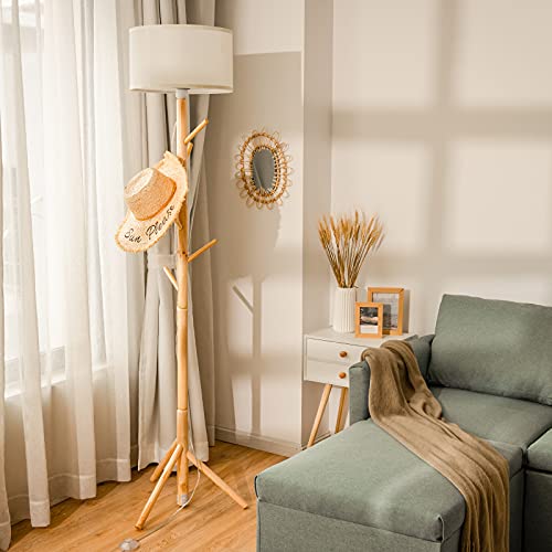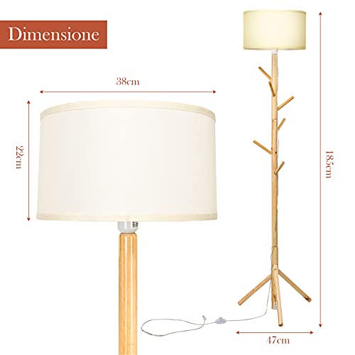 COSTWAY Lampada da Terra Vintage e Design, Lampada a Stelo Multifunzionale in Legno con 6 Ganci, Interrutore a Pedale, Lampada Moderna per Camera da Letto, Salotto e Studio
