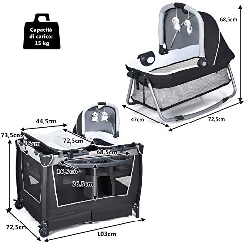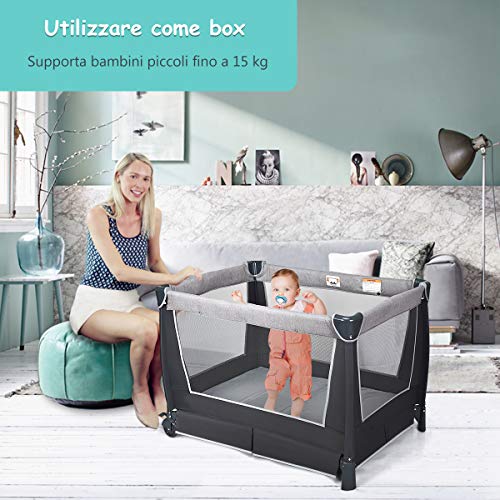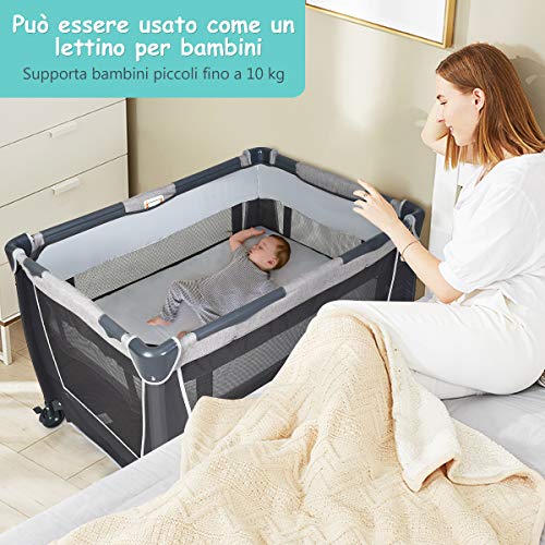 COSTWAY 4 in 1 Lettino Neonato da Viaggio Pieghevole con Materasso, Culla da Campeggio con Fasciatoio e Giocattolo, per Bambini 0-36 Mesi fino a 15 kg (Grigio Scuro)