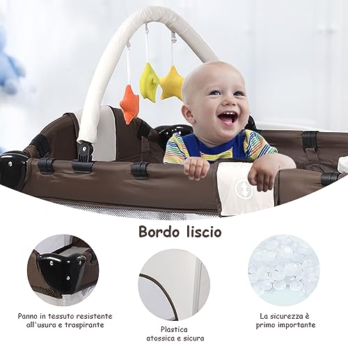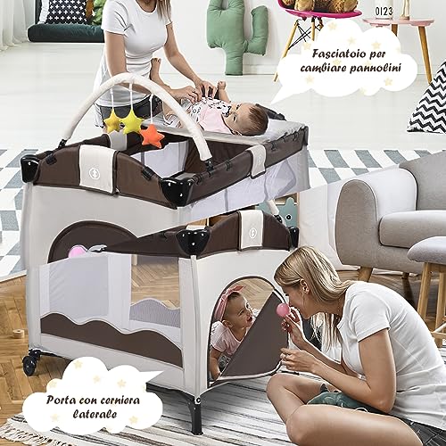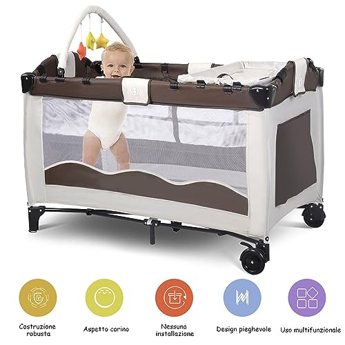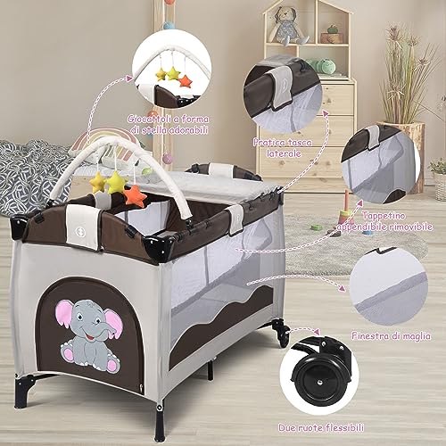 COSTWAY Lettino da Viaggio Lettino da Campeggio per Bambini Culla Neonato, Incluso Materasso + Accessori, 125 x 66 x 77 cm (Marrone)