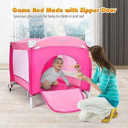 COSTWAY Lettino da Viaggio, Culla Neonato Pieghevole con Fasciatoio, per Bambini 0-36 Mesi Fino a 15 kg, con Giocattoli, Zanzariera, 2 Ruote, 124 x 65 x 121cm (Rosa)