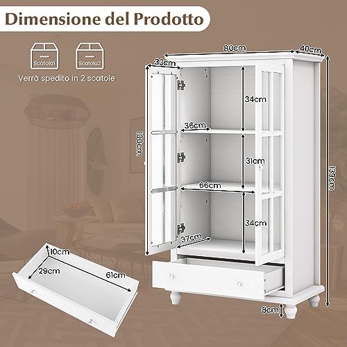 COSTWAY Mobile Libreria, Vetrinetta Espositiva Alta con Ante in Vetro Temperato, Libreria Verticale in legno con Ripiani Regolabili e Cassetto, per Soggiorno, Camera da Letto, 80 x 40 x 139 cm
