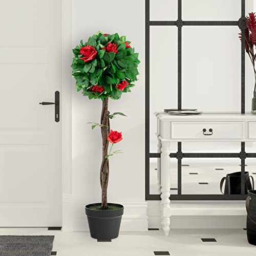 COSTWAY Pianta Finta da Interno da 92 cm, Albero di Camelia Artificiale con 12 Fiori Rossi, 180 Foglie e Vaso Riempito di Cemento, Pianta Finta per Soggiorno e Ufficio