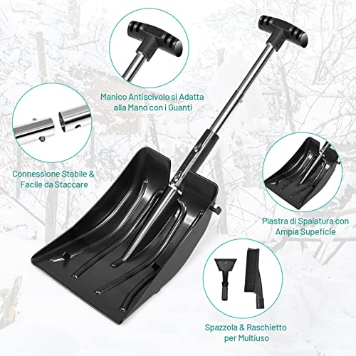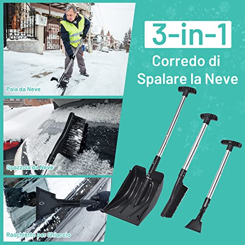 COSTWAY Kit Pala da Neve 3 in 1, Pala da Neve Pieghevole con Raschietto per Ghiaccio e Spazzola da Neve, in Alluminio, con Borsa da Trasporto, per Auto, Campeggio, Cortile