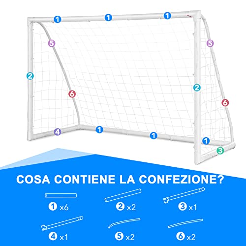 【Porta da calcio molto resistente per bambini】Questa porta da calcio resistente alle intemperie ha la struttura con pali spessi in UPVC e rinforzata dalle giunzioni. La parte posteriore della struttura garantisce una stabilità extra mentre i 6 paletti sono inclusi per fissare la porta sul terreno. Non si deformerà facilmente, non si romperà e non si ribalterà.