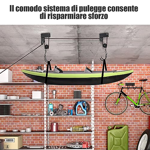 【Comodo e versatile】il porta kayak è ideale per soffitti da interno e si può usare in garage, in autofficina e in fabbrica. Con una struttura resistente, si può appendere il kayak ma anche bici, canoe, scale a pioli e altri articoli vari. Solleva articoli pesanti fino a 45 kg.