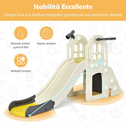 COSTWAY Scivolo per Bambini 6 in 1, Set da Gioco per Bambini con Canestro, Palla, Lancio dell'Anello e Cannocchiale, Ideale per Interni ed Esterni per Ragazzi e Ragazze, 189,5 x 83 x 98 cm (Giallo)