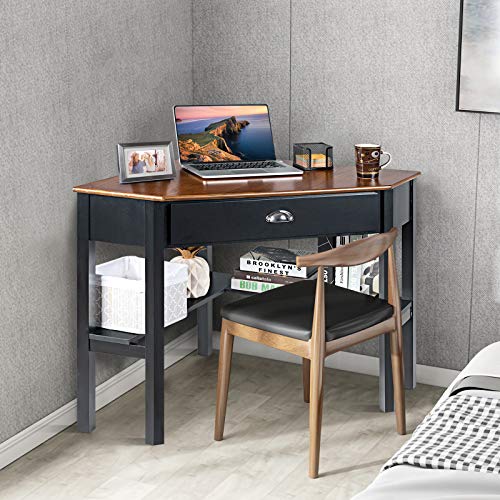 COSTWAY Scrivania Angolare in Legno per Computer, Scrivania Porta PC Cassetto e Ripiano, Scrivania Salvaspazio e Moderna per Ufficio e Studio (Marrone)