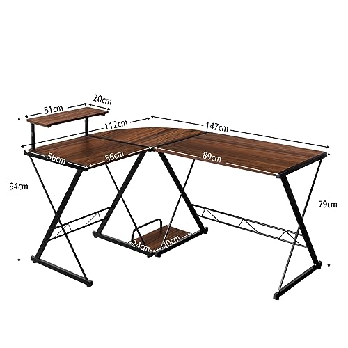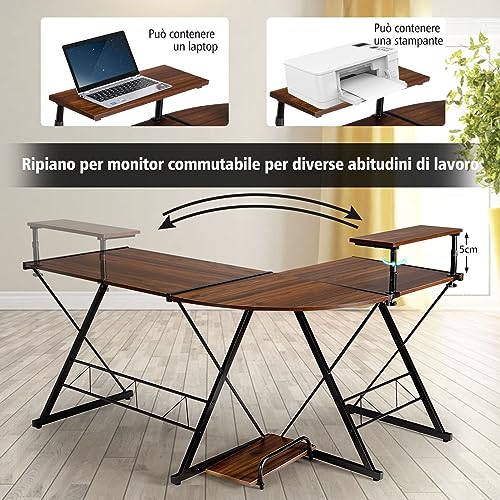 COSTWAY Scrivania Angolare Salvaspazio, Scrivania di Metallo e Legno con Supporto per Monitor e Ripiano, Scrivania ad Angolo Staccabile per Ufficio e Casa (Noce)