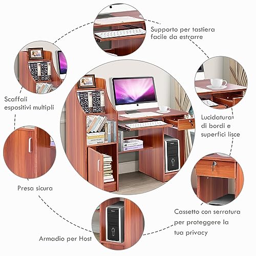 COSTWAY Scrivania per Computer con Libreria, Tavolo di Legno Resistente con Mensole e Armadio, Postazione di Lavoro Moderna per Ufficio e Casa, Design Salva Spazio e Multiuso, Noce