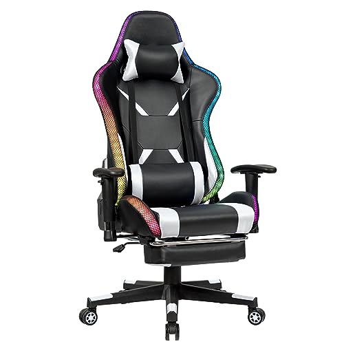 COSTWAY Sedia Gaming Led 7 Colori, Altezza Regolabile e Braccioli 2D, Sedia da Gaming Ergonomica con Poggiapiedi, Cuscini Lombari e Cervicali, Sedia Ufficio Reclinabile 155°, Capacità 150 kg (Bianco)