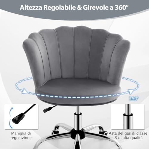 COSTWAY Sedia da Scrivania in Velluto, Poltrona Girevole con Altezza Regolabile, con Schienale a Forma di Petalo e Ruote, per Casa Ufficio, Carico Massimo 150 kg (Grigio)