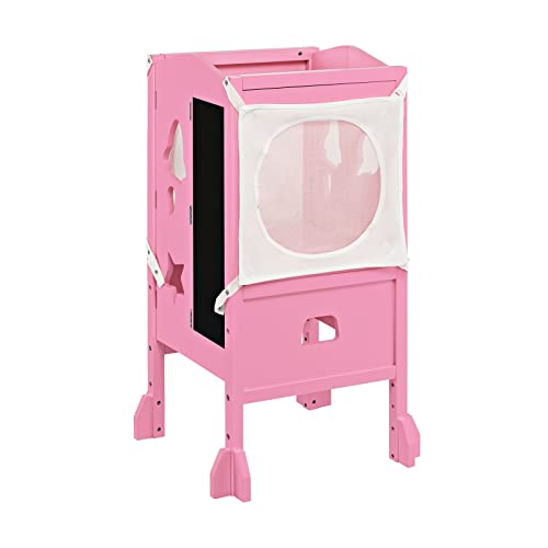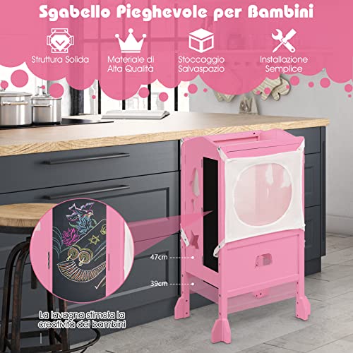 COSTWAY Sgabello da Cucina per Bambini in Legno, Torre di Apprendimento Pieghevole con Altezza Regolabile su 2 Livelli, Rete di Sicurezza e Lavagna, 53 x 50 x 94 cm (Rosa)