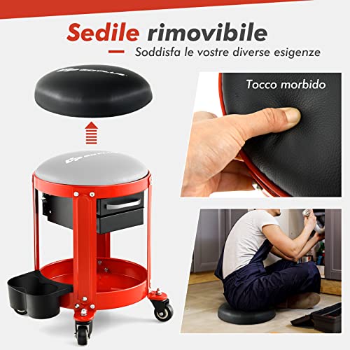 【Tenere gli Strumenti a Portata di Mano】Questo sgabello meccanico rotante comprende 2 cassetti in due direzioni, ripiano e un vassoio in plastica rimovibile.