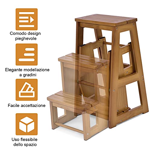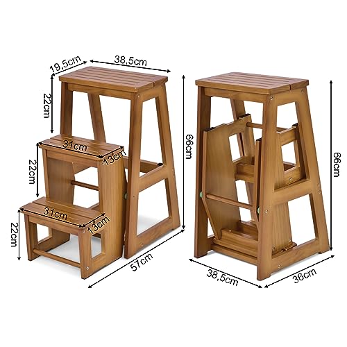 COSTWAY Sgabello Scaletta 3 Gradini in Legno di Pino, Sgabello Scala Pieghevole Salvaspazio, Scaletta 3 Gradini a Ribalta, Capacità Portante 150 kg, 57 x 38,5 x 66cm (Naturale)