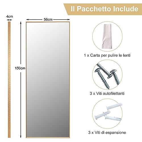 COSTWAY 2 in 1 Specchio Lungo da Parete, Specchio a Figura Intera con Telaio Rettangolare in Alluminio e Vetro Antiesplosione, Specchio da Terra per Ingresso Bagno, 56 x150 cm (Oro)