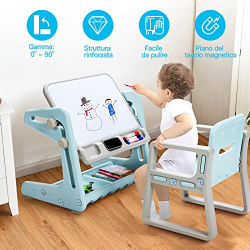 COSTWAY Set Tavolo da Gioco per Bambini con Sedia 2 in 1, Tavolo Magnetico Regolabile in Altezza, con Lavagna per Disegnare (Blu)
