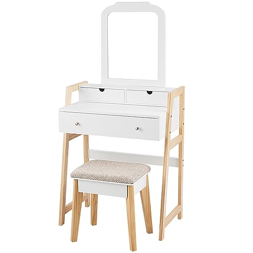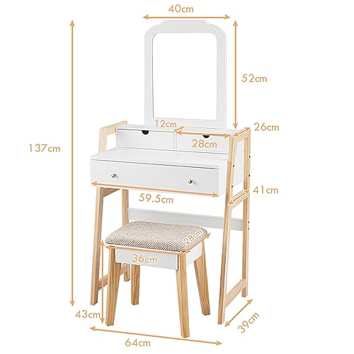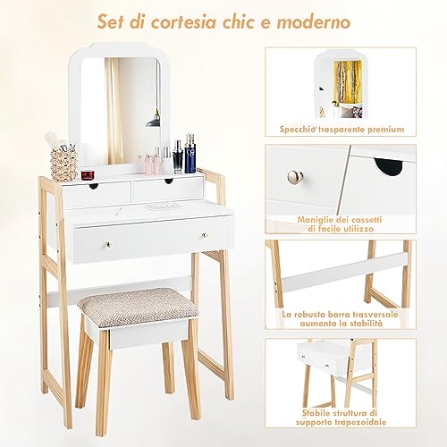 COSTWAY Set di Tavolo da Toeletta, Tavolo da Trucco con Sgabello e Specchio Regolabile in Altezza, 3 Cassetti, Bianco Moderno Minimalista
