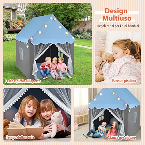 COSTWAY Tenda da Gioco per Bambini, Tenda Castello con Tappetino Lavabile, Luci a Forma di Stella, per Interno ed Esterno, 105 x 121 x 136 cm (Azzurro)
