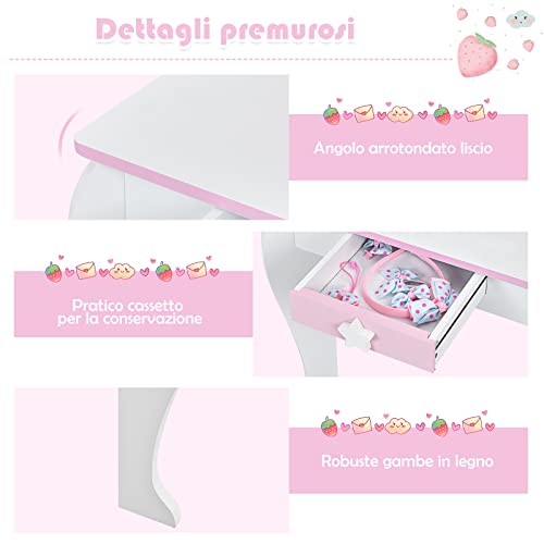 COSTWAY Set Toeletta per Bambini con Sgabello Specchio e Cassetti, Toeletta per Bambini in Legno, Rosa e Bianco 89x49,5x35,5cm (Bianco)