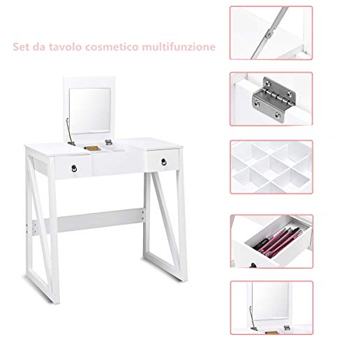 COSTWAY Toeletta da Trucco con Sgabello e Specchio Richiudibile, Toeletta Trucco di 2 Cassetti, 1 Vano Contenitore, Ideale per Camera da Letto, Bianco