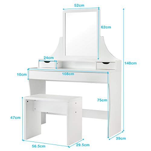 COSTWAY Set di Toletta con Sgabello, Dotato di 3 Cassetti e Specchio, Ideale per Camera da Letto e Bagno, Bianco