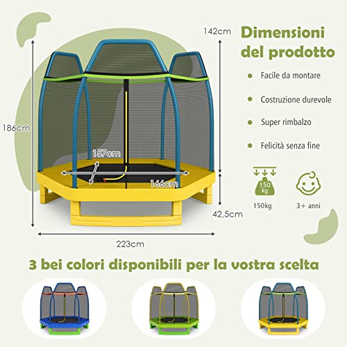 COSTWAY Trampolino Elastico per Bambini 223 cm, Tappeto Elastico per Bambini in Acciaio, con Rete e Cuscinetto a Molle, Ideale per Giardino e Cortile, Carico Massimo 50 kg (Verde)