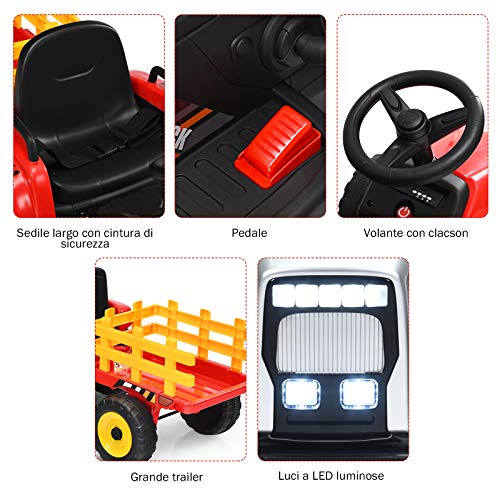 COSTWAY Trattore con Rimorchio Cavalcabile per Bambini 12V, Trattore Elettrico Telecomandato, con Luci e Suoni, 30kg, 3+ Anni (Rosso)