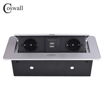 COSWALL Zinc Alloy Plate 16A Slow POP UP 2 Power EU Socket Dual USB Charge Port 2.1A Office Table Desktop Outlet Black Steel Box