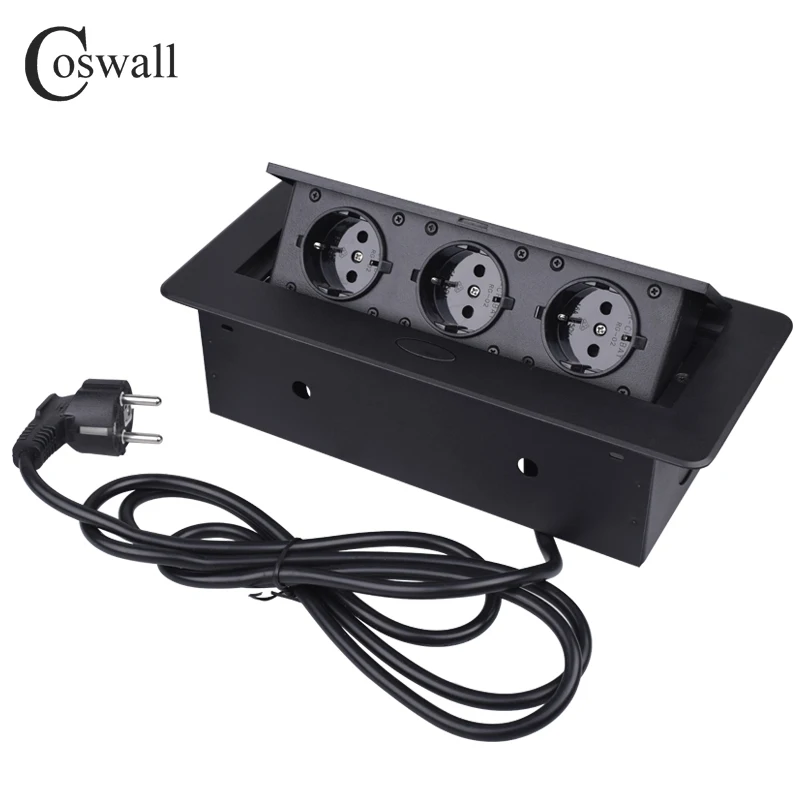 COSWALL Zinc Alloy Plate Slow Soundless POP UP Hidden 3 Power EU Socket Office Table Outlet Grounded With 1.3M Extension Plug
