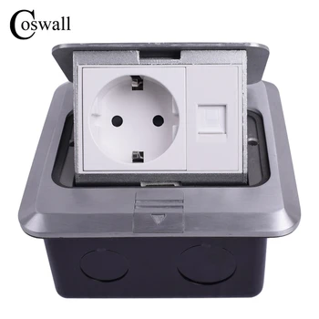 Coswall All Aluminum Silver Panel EU Standard Pop Up Floor Socket Electrical Outlet With RJ45 Internet Computer Port