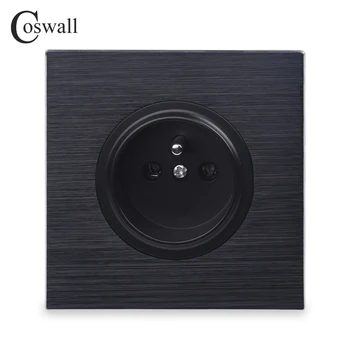 Coswall Black / Silver Grey Brushed Aluminum Panel French Standard Wall Power Socket Outlet Grounded With Child Protective Lock