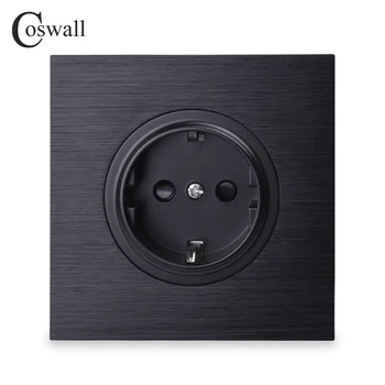 Coswall Black / Silver Grey Brushed Aluminum Panel EU Russia Spain Wall Power Socket Outlet Grounded With Child Protective Lock