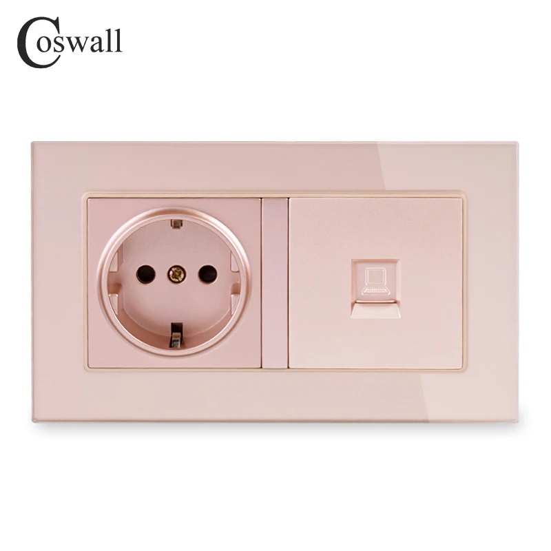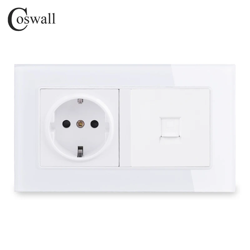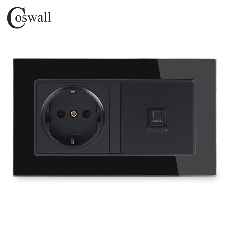 COSWALL 16A Russia Spain EU Standard Socket Grounded + 1 Gang RJ45 CAT5E Internet Computer Data Connector Tempered Glass Panel