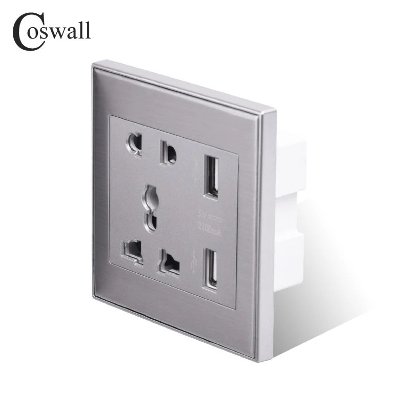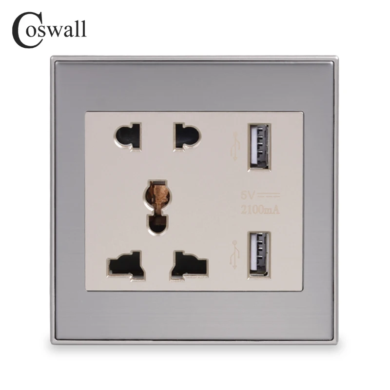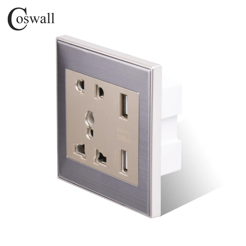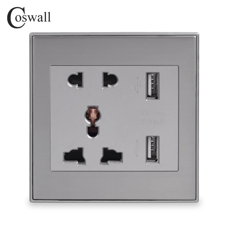 Coswall Stainless Steel Panel Universal Wall Socket 2.1A USB Charger 2 Ports USB Outlet Power Charger For Phone Grey / Gold