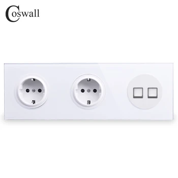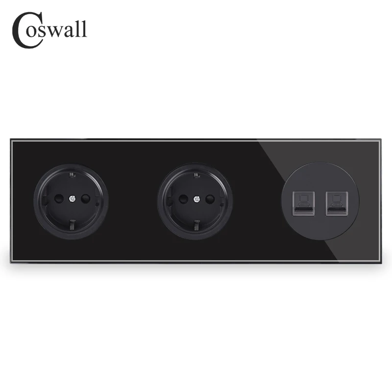 Coswall Tempered Glass Panel 16A Double EU Standard Wall Socket + 2 Gang CAT5E RJ45 Internet Data Computer Jack R11 Series
