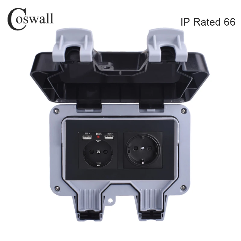 Coswall IP66 Weatherproof Waterproof Outdoor Wall Power Socket 16A Double EU Standard Outlet With Dual USB Charging Port 2.1A