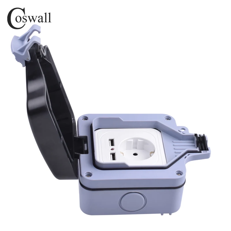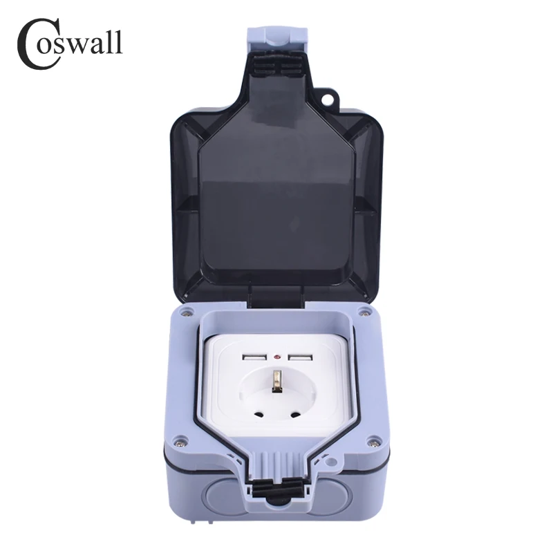 Coswall IP66 Weatherproof Waterproof Outdoor 16A EU Standard Wall Power Socket With Dual USB Charging Port 2.4A Output