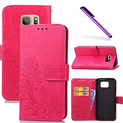 COTDINFOR Galaxy S7 Custodia Cover Elegante Retro Donna Clover Embossing PU in Pelle con Wallet Card Holder Flip Custodia per Samsung Galaxy S7 Clover Red SD