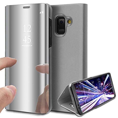 COTDINFOR Galaxy A6 2018 Custodia Placcatura Specchio Clear View Standing Cover Slim Mirror Flip Portafoglio Antiurto Case con Funzione Stand per Samsung Galaxy A6 2018 Mirror PU Silver MX.