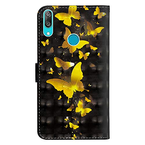 COTDINFOR pour Huawei Y7 2019 Custodia Cover TPU 3D Effect Painted PU in Pelle con Wallet Card Holder Magnetico Ultrasottile Antiurto Flip Custodia per Huawei Y7 2019 Golden Butterflies YX