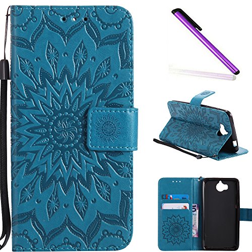 COTDINFOR Huawei Y5 2017 Custodia Premium PU Leather Mandala Fiore Elegante Wallet Custodia a Rilievo Custodia Folio Flip Cover Case con Kickstand Card per Huawei Y5 2017 Blue Sunflower KT.
